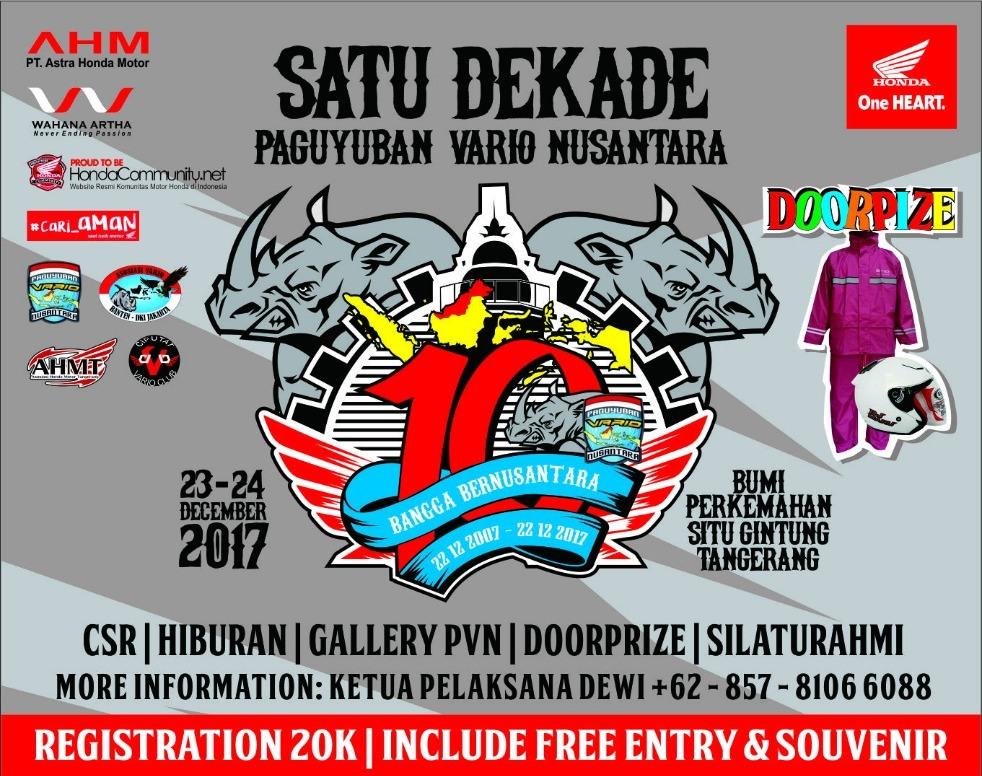Kawan-kawan..... Akhir pekan ini tepatnya tanggal 23-24 Desember 2017 paguyuban Vario Nusantara akan memperingati hari jadinya yang ke-10, berbagai kegiatan siap digelar untuk memeriahkan hari jadi paguyuban pengguna Honda Vario di Tanah Air ini.