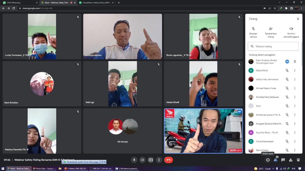 Edukasi yang diberikan bersifat Online menggunkan Sistem Webinar yang dimana Astra Motor Kalimantan Barat selalu memberikan yang terbaik untuk karyawan agar tetap aman ketika mendapatkan edukasi safety riding, banyak games yang diberikan untuk peserta yang membuat edukasi safety riding ini sangat seru dan nyaman di ikuti.