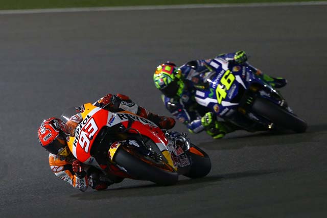 Pembalap tim Repsol Honda Marc Marquez harus puas finish di posisi ke-3, dalam perhelatan seri perdana MotoGP yang berlangsung di Losail International Circuit, Doha, Qatar (20/3). Meski mengawali start dari posisi ke-2, perlawanan dari pembalap lain pun cukup ketat.