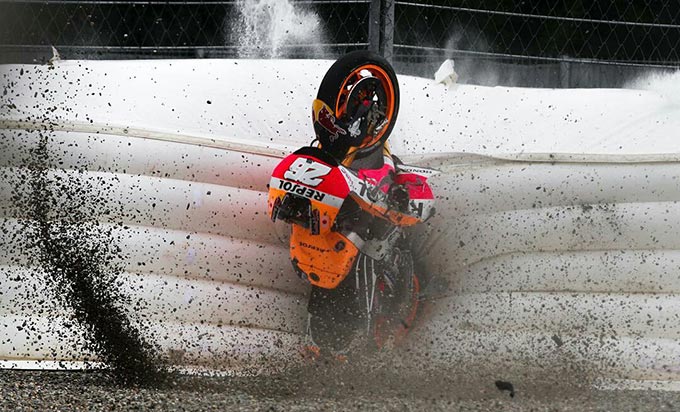 Dalam insiden ini, Pedrosa kehilangan grip ban depan sesaat setelah roda depan terkunci saat memasuki tikungan, dirinya langsung terseret beberapa meter ke tepi sirkuit. "Sirkuit ini amat impresif, ada bagian di sirkuit ini dimana pebalap harus membuka throttle sedalam dan selama mungkin," kata Pedrosa dalam wawancara sehari sebelumnya (11/8).
