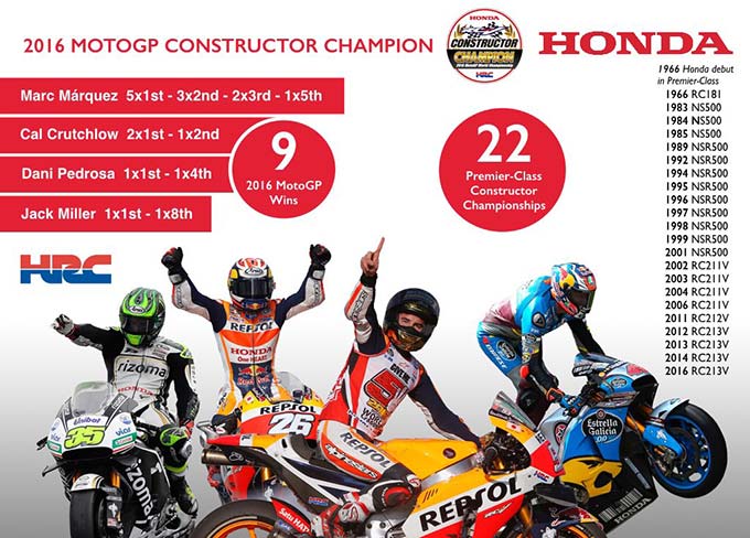 Tahun 2016 menjadi musim yang gemilang didapatkan pabrikan Honda di kejuaraan dunia MotoGP. Lewat pebalapnya, Marc Marquez mampu meraih juara dunia menggunakan Honda RC213V di tahun ini. Dan dari segi pabrikan, Honda juga meraih juara konstruktor.