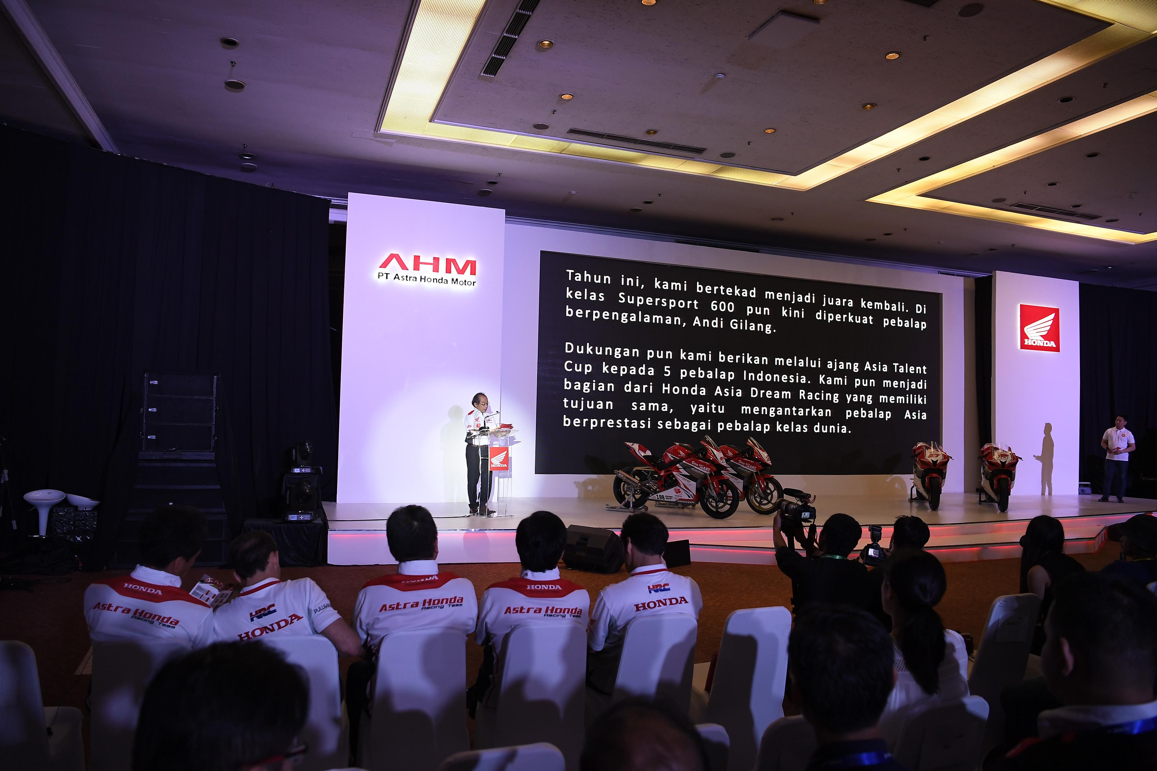 "Astra Honda Motor terus berusaha untuk mendukung pembalap Indonesia dalam mewujudkan mimpi mereka. Mimpi para pembalap adalah ikut balapan World Championship dan menjadi juara. Untuk mendukung hal tersebut, kami terus mengikutkan mereka di berbagai kompetisi demi menajamkan fisik dan kemampuan balap. Dukungan kami terwujud melalui pengembangan para pebalap, mekanik, dan tim," ujar Toshiyuki Inuma, President Director of PT Astra Honda Motor.