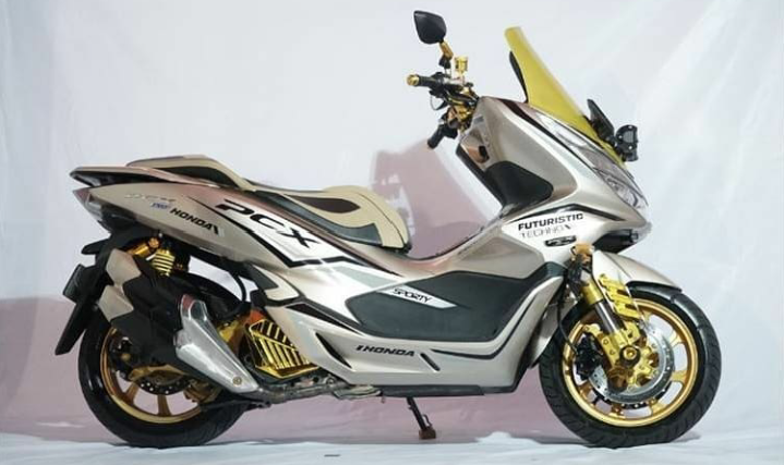 Warna Body dari Honda All New PCX 150 ini tidak diubah warnya dibiarkan saja warna aslinya cuma dikasih stiker pemanis supaya aroma futuristik tersasa.Mulai dari Velg masih gunakan standart dengan ubahan warna yang emas, ada tambahan dalam remnya kini menjadi Double Disk milik original Honda Tiget Revo. Dan bagian Suspensi depan diganti UpSide Down dengan Adjuster Set Segitiga milik Yamaha NMAX, bagian Suspensi belakang juga diganti Shock Tabung Ohlins original milik Honda vario 2007 dari bro vivid. Untuk spakbord depan masih standrt dari Yamaha NMAX juga, namun ada tambahanya Spakbordnya. Kaliper dari Disk ada dua satunya standrt bawaan Honda PCX yang satunya gunakan punya Kawasaki Ninja 250, untuk Ban gunakan ukuran yang sedikit agak lebar dengan ukuran depan 120/70 belakang gunakan ukuran 140/70 merk pirrelli Anggel Sccooter. Cover radiator fast bikers. Mufler Knalpot original CBR250RR