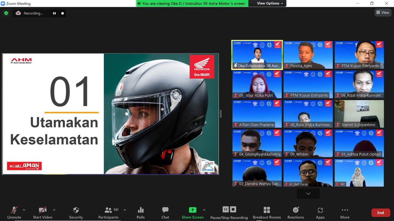 Semarang – Mewujudkan generasi muda yang paham keamanan dalam berkendara terutama disaat pengajaran tatap muka dan aktivitas lain mulai berjalan, instruktur senior safety riding Astra Motor Jateng bersama dengan psikolog dan pihak Kepolisian Semarang Jawa Tengah telah mengadakan seminar “Generasi #Cari_Aman Untuk Indonesia” yang disiarkan secara live kemarin (25 September) pada akun Youtube DChannel FKIP dan secara khusus mengundang pelajar dari Universitas Sebelas Maret Surakarta.