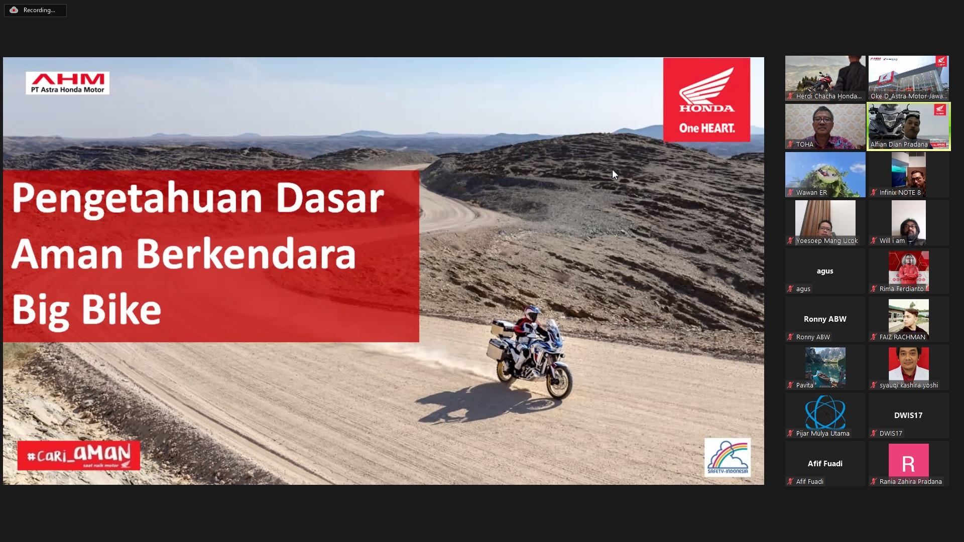 Semarang – Mengusung tema “#Cari_Aman dan Prediksi Bahaya dalam Mengendarai Motor Big Bike”, Astra Motor Jateng memberikan Workshop Safety Riding special bagi 18 konsumen Honda Big Bike Jateng yang diadakan secara virtual pada hari Jumat (26/11/21) kemarin.