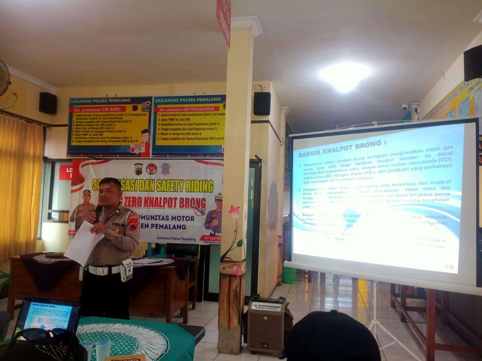 Dalam sosialisasi tersebut, petugas Satlantas Polres Pemalang menjelaskan bahwa penggunaan knalpot brong merupakan pelanggaran lalu lintas yang dapat dikenakan sanksi berupa tilang. Selain itu, penggunaan knalpot brong juga dapat mengganggu kenyamanan dan keselamatan masyarakat, terutama bagi pengendara lain dan warga yang tinggal di sekitar jalan raya.