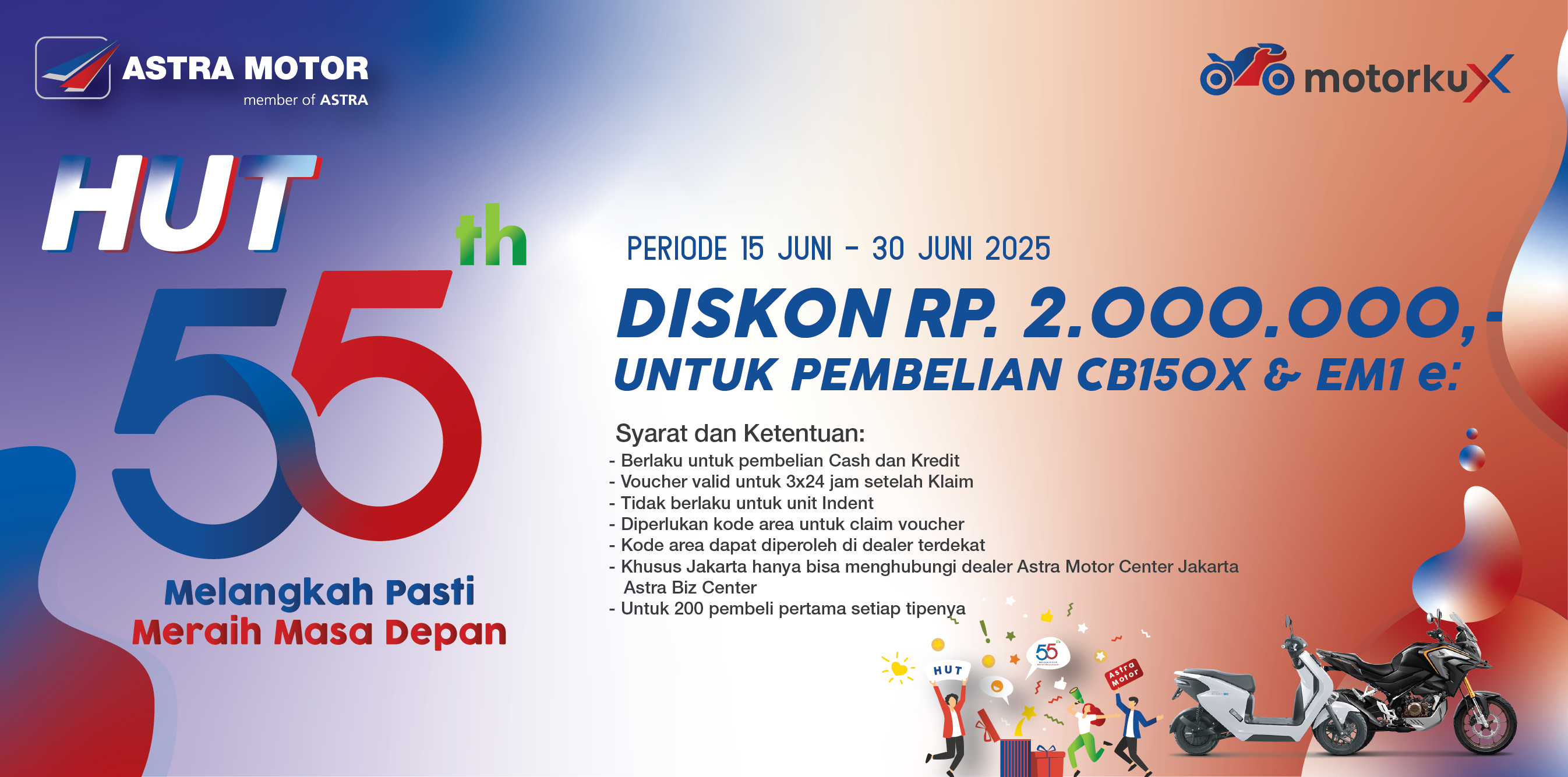Selain penjualan produk, Astra Motor juga memberikan Voucher Diskon 55% Jasa Service Lengkap dalam rangka HUT Astra Motor ke-55. Periode ini berlaku mulai 15 Juni sampai dengan 15 Juli 2025 di seluruh AHASS Jateng (tidak termasuk Kedu, Banyumas) dengan syarat dan ketentuan berlaku.